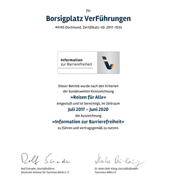 Die Borsigplatz VerFührungen wurden nach den Kriterien der bundesweiten Kennzeichnung »Reisen für Alle« eingestuft und ist berechtigt, die Auszeichnung »Information zur Barrierefreiheit« zu führen und zu nutzen.